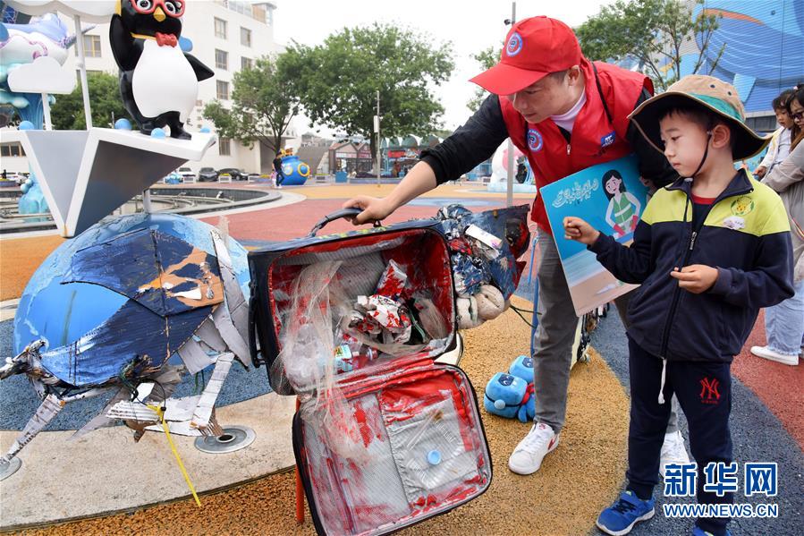 6月5日,志愿者薛操(左)在为一名小男孩介绍用海洋垃圾创作出的作品《绝望的大鱼》。该作品展示海洋动物误食各种垃圾后的状态。新华社记者 李紫恒 摄