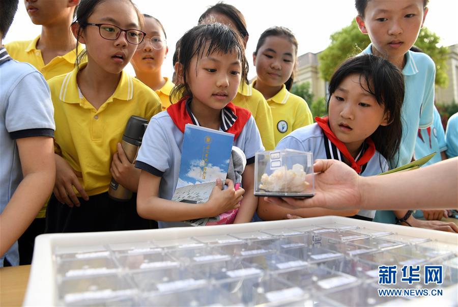 6月5日,合肥一六八玫瑰园学校学生在观看矿石标本。新华社记者刘军喜摄