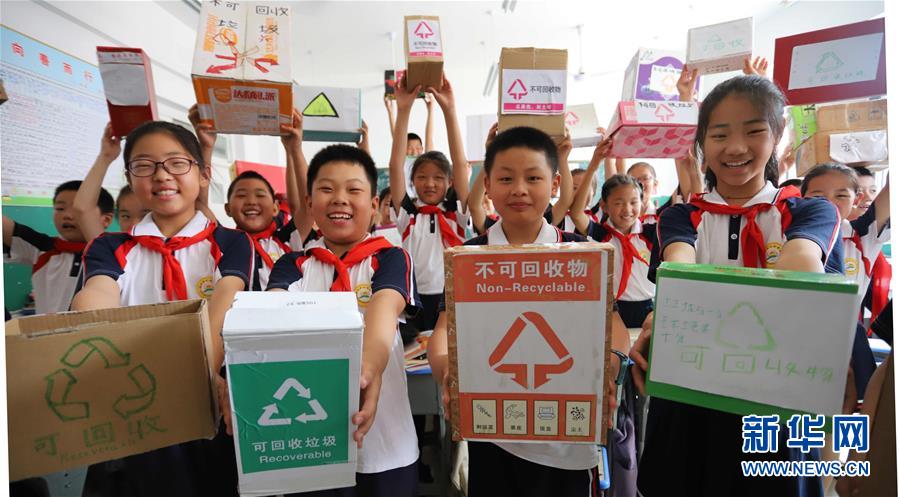 6月5日,河北临西县光明小学学生展示自己制作的“垃圾分类箱”。新华社发(张玉坤摄)