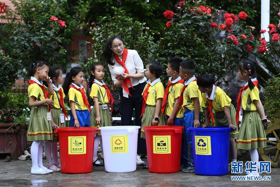 6月5日,贵州省台江县城关一小学生听老师讲解垃圾分类知识。新华社发(欧阳光林摄)