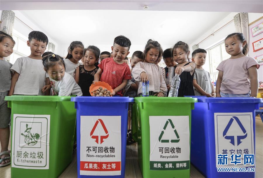 6月5日,河北省临漳县第一幼儿园的小朋友参加垃圾分类比赛。新华社发(王洪超摄)