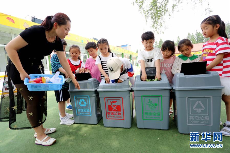 6月5日,江苏省东海县第三幼儿园的老师指导幼儿进行垃圾分类。新华社发(张开虎摄)