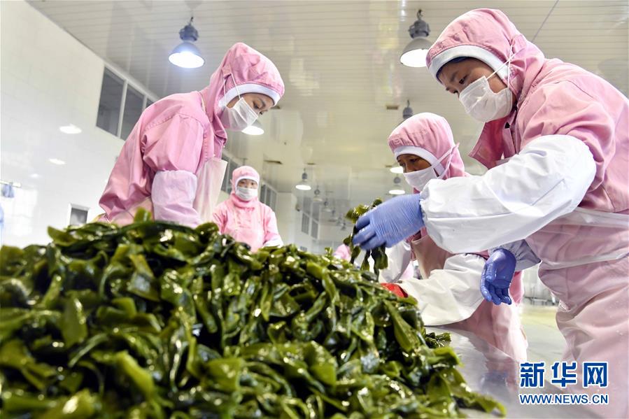 6月5日,在荣成一家水产养殖公司,工作人员在加工海带。 近日,山东省荣成市迎来海带收获季。据悉,荣成市海带养殖面积14.5万亩,年产海带43.3万吨以上。 新华社记者林繁晶摄