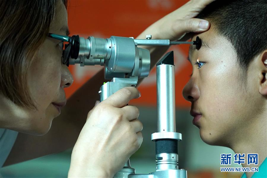 6月4日,来自上海普瑞眼科医院的医生在新疆喀什市第三师第一中学为学生检查眼睛。 新华社记者陈建力摄