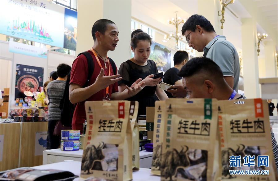 6月5日,参观者(左)在一家西藏食品企业展台前与工作人员交流。新华社记者 方喆 摄