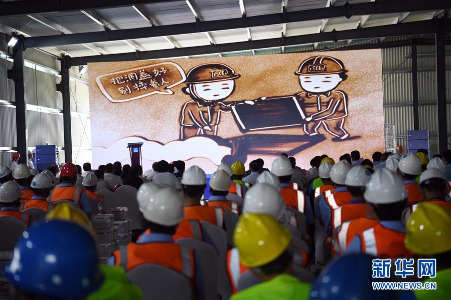6月5日,工人代表在启动仪式上观看沙画《安全员的坚守》。 当日,2019年全国安全生产月暨“安康杯”竞赛启动仪式在北京举行。 新华社记者金良快摄