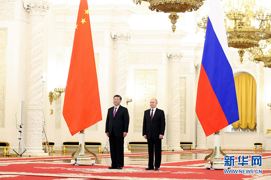 6月5日,国家主席习近平在莫斯科克里姆林宫同俄罗斯总统普京会谈。这是会谈前,普京总统在克里姆林宫乔治大厅为习近平举行隆重欢迎仪式。 新华社记者 丁林 摄