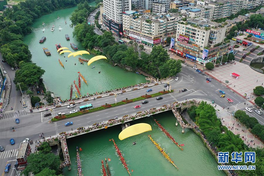 6月5日,人们在贵州省铜仁市碧江区锦江河上参加龙舟巡游活动(无人机拍摄)。新华社发(伍卫东摄)