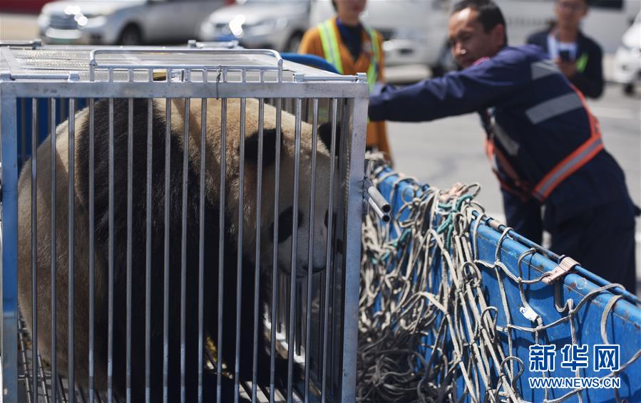 6月5日,工人在搬运抵达青海西宁曹家堡机场的大熊猫。