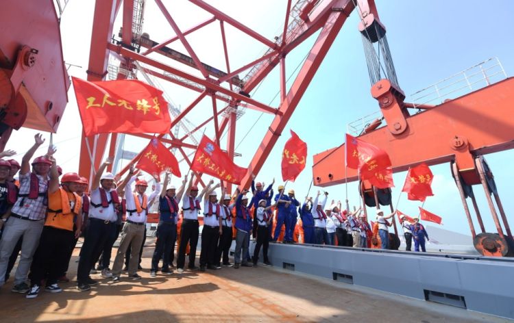 6月5日,福平铁路平潭海峡公铁两用大桥元洪航道桥主桥成功合龙后,员工欣喜庆祝。(新华社记者林善传 摄)