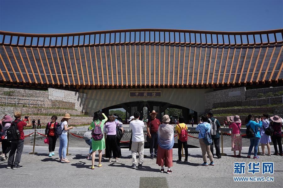 参观者在北京世园会中国馆前参观留影(6月3日摄)。 新华社记者 鞠焕宗 摄