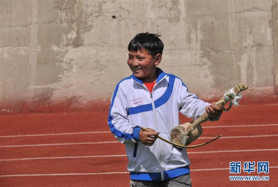 盐井中学学生在课间跳弦子操时拉奏弦子(6月5日摄)。 从2011年开始,芒康县盐井中学将弦子舞改编成课间弦子操,让传统文化在校园得到传承和发展。 新华社记者 晋美多吉 摄
