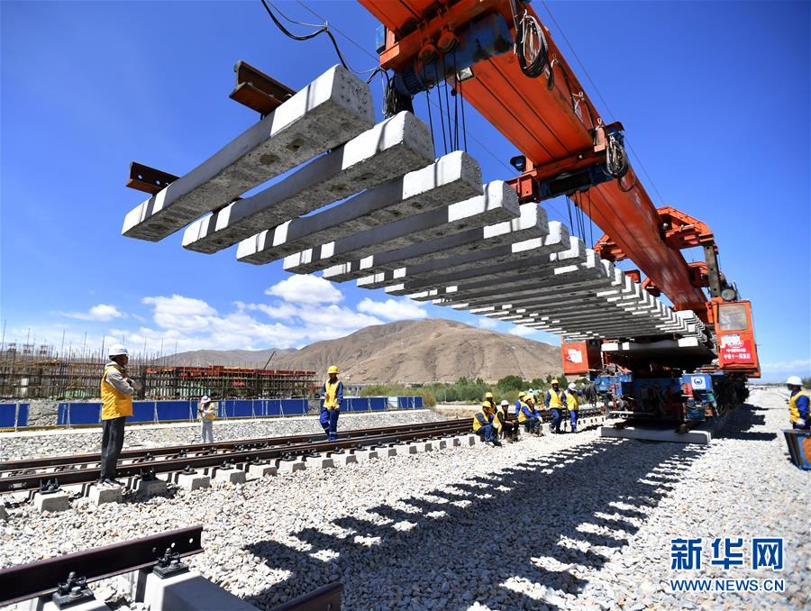 6月6日,负责铺轨的中铁十一局集团的建设者在现场作业。新华社记者 觉果 摄