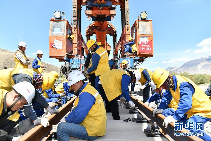 6月6日,负责铺轨的中铁十一局集团的建设者在现场作业。新华社记者 李鑫 摄