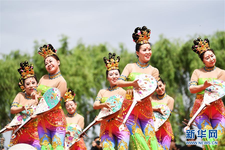 6月7日,在兰州黄河岸边端午活动现场,中老年舞蹈爱好者表演敦煌舞蹈。 当日是我国传统节日端午节,甘肃省兰州市多个国学社团和民俗文化爱好者在黄河岸边举行端午民俗活动。 新华社记者 陈斌 摄
