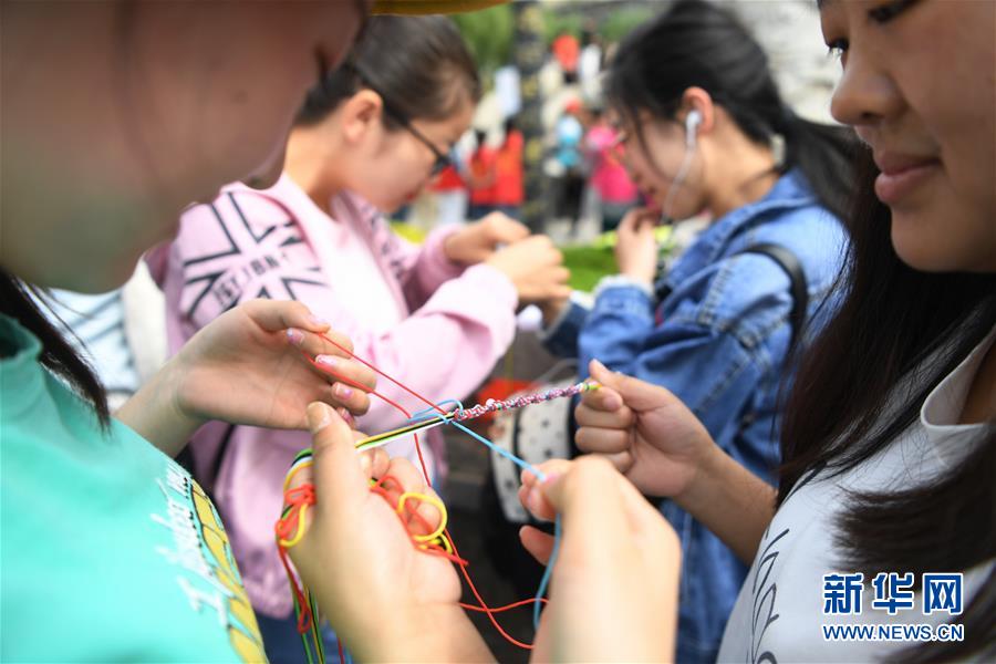 6月7日,市民在兰州黄河岸边端午活动现场编织彩线。 当日是我国传统节日端午节,甘肃省兰州市多个国学社团和民俗文化爱好者在黄河岸边举行端午民俗活动。 新华社记者 陈斌 摄