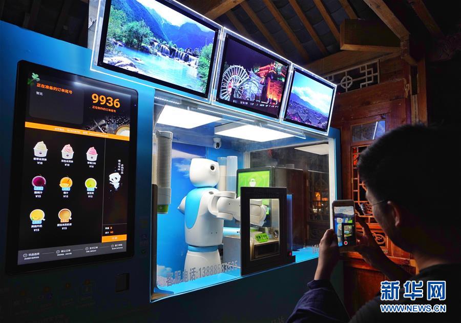 6月6日,游人在云南丽江古城体验智能机器人服务。 在夜色中的世界文化遗产云南丽江古城灯光璀璨,越夜越美丽。 新华社记者 秦晴 摄
