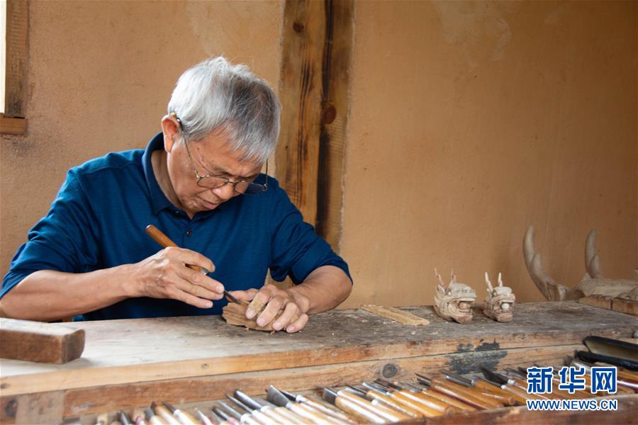6月6日,湖南省汨罗市屈子文化园内,71岁的汨罗民间龙舟手艺人郑亮辉在进行龙舟工艺品雕刻。 新华社记者 柳王敏 摄