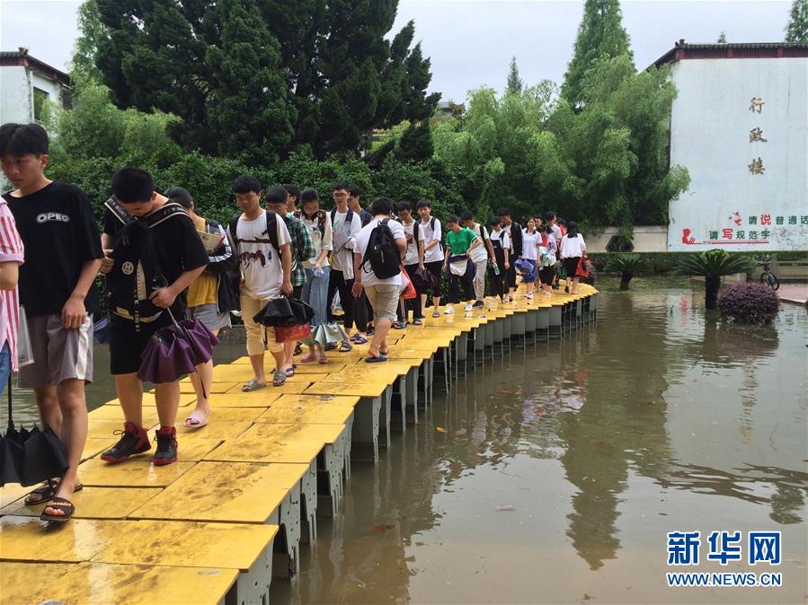 6月7日,在江西上饶市玉山县玉山一中考点内,考生们通过由课桌拼成的“浮桥”进入考场考试。 当日是2019年全国高考第一天,江西上饶市玉山县在6月6日遭遇大暴雨,城区部分地区积水。在玉山一中考点内,老师们用课桌临时拼成一座“浮桥”,帮助考生们顺利进入考场考试。 新华社发