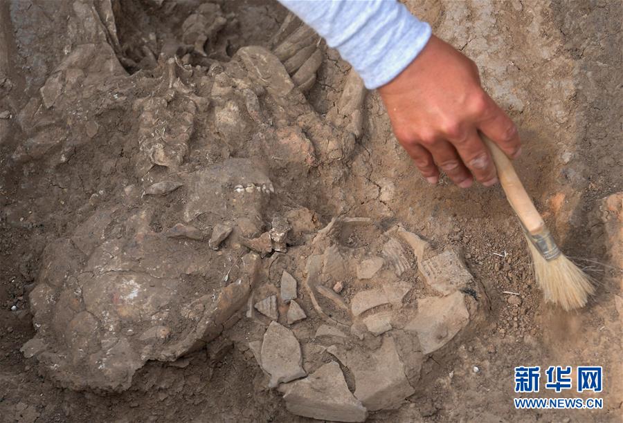 工作人员在清理河南省安阳市洹北商城发现的商代铸铜工匠家族墓地(6月5日摄)。新华社记者 李安 摄
