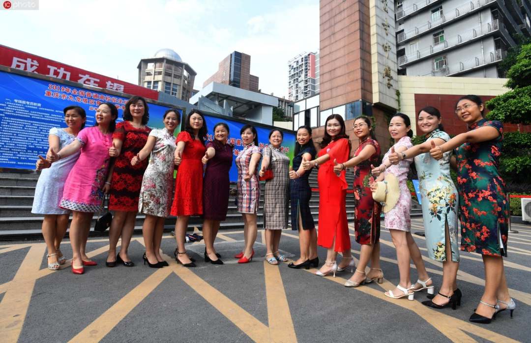 2019全国普通高校招生统一考试重庆九龙坡区育才中学考点外,几位考生的妈妈穿着漂亮的旗袍,前来为孩子加油助威,寓意“旗”开得胜。