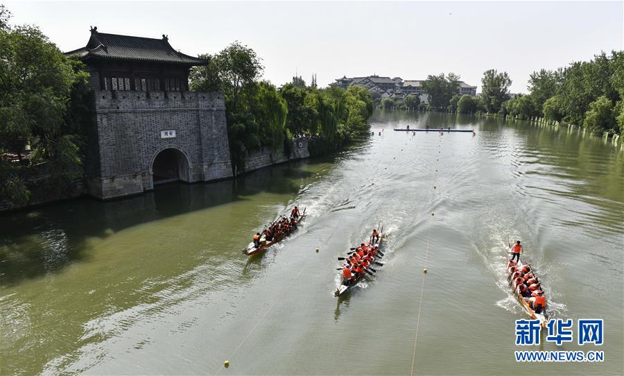 6月7日,人们在山东省枣庄市台儿庄古城古运河道上划龙舟。 新华社发(高启民摄)
