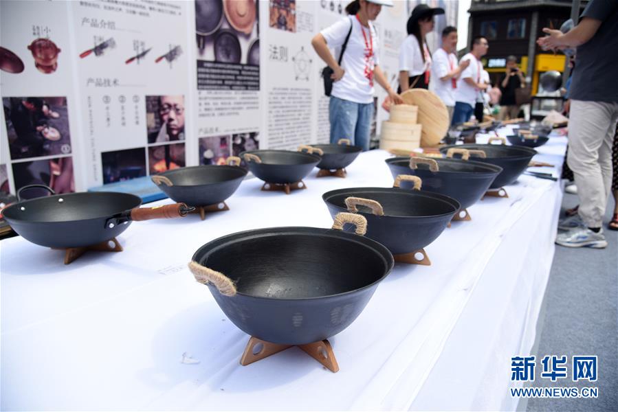 这是现场义卖的章丘铁锅(6月7日摄)。 当日,济南世茂广场举行一场章丘铁锅锻打现场展演义卖活动。70位来自章丘的打锅工匠在现场演示章丘铁锅的冷锻技艺,现场打造及展示的产品均采用义卖的形式销售,所得善款全部捐助慈善机构。 新华社记者 王凯 摄