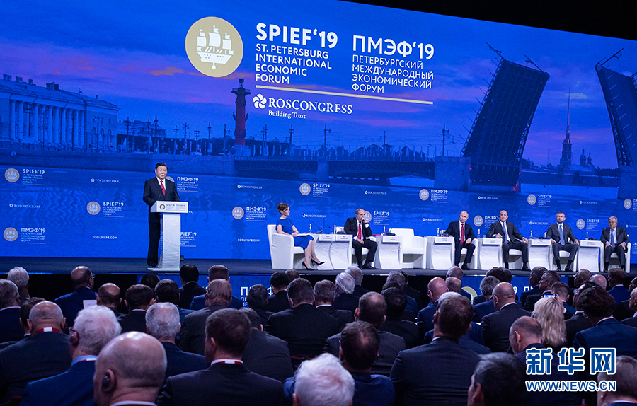 6月7日,第二十三届圣彼得堡国际经济论坛全会在圣彼得堡举行。中国国家主席习近平、俄罗斯总统普京、保加利亚总统拉德夫、亚美尼亚总理帕希尼扬、斯洛伐克总理佩列格里尼、联合国秘书长古特雷斯等出席。这是习近平发表题为《坚持可持续发展 共创繁荣美好世界》的致辞。 新华社记者 李涛 摄