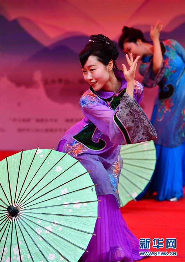 6月8日,福州市闽都文化艺术中心演员表演舞蹈《烟雨坊巷》,主要展示“福州三宝”之一福州油纸伞。 当日,2019年“文化和自然遗产日”福建宣传系列活动启动仪式在福州三坊七巷举行,现场举行了20多项展演展示活动。 新华社记者 魏培全 摄