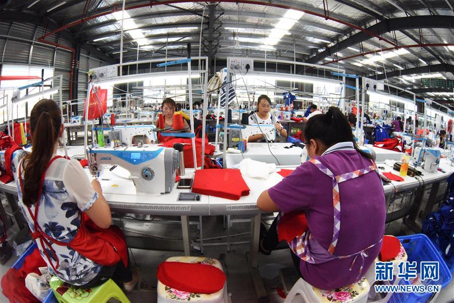 6月6日,搬迁户们在晴隆县阿妹戚托小镇的扶贫车间里加工服装。新华社记者 杨文斌 摄