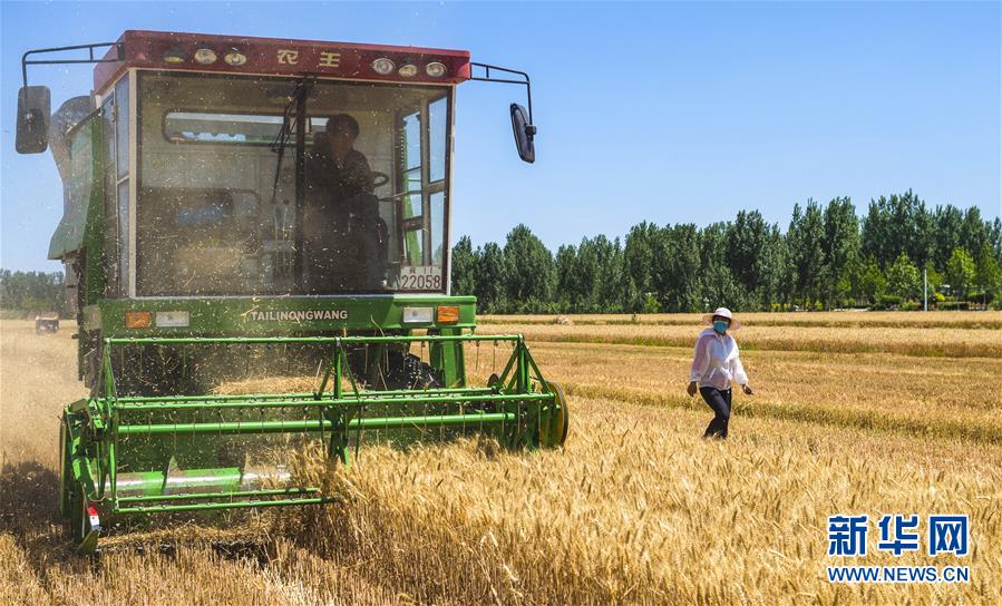 6月9日,收割机在河北省枣强县恩察镇关屯村的麦田里收割小麦。 “三夏”时节,华北平原麦田满目金黄,麦收工作进入高峰期。多地农民抓住天气晴好的有利时机抢收小麦,田野里呈现出一派繁忙景象。 新华社记者 李晓果 摄