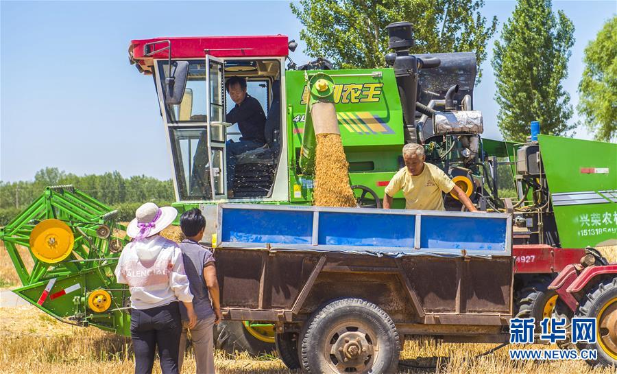 6月9日,河北省枣强县恩察镇关屯村的农民在收获小麦。 “三夏”时节,华北平原麦田满目金黄,麦收工作进入高峰期。多地农民抓住天气晴好的有利时机抢收小麦,田野里呈现出一派繁忙景象。 新华社记者 李晓果 摄