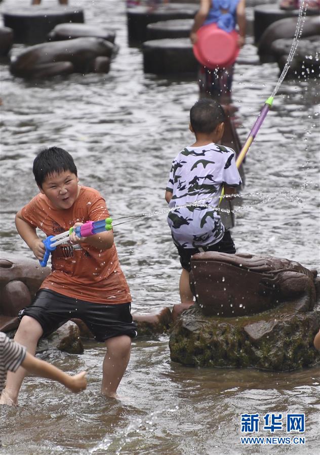 6月9日,小朋友在黄龙溪古镇景区内玩水。