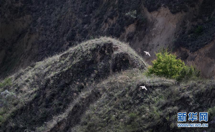 两只山鸡飞翔在陕西省吴起县金佛坪山川间(6月5日摄)。 新华社记者陶明摄
