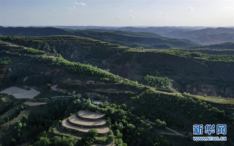 陕西省吴起县西沟塔村周边退耕后的绿色山峁与田野(6月5日无人机拍摄)。2013年,吴起县启动了新一轮退耕还林工程,累计又完成退耕还林21.3万亩。 新华社记者陶明摄