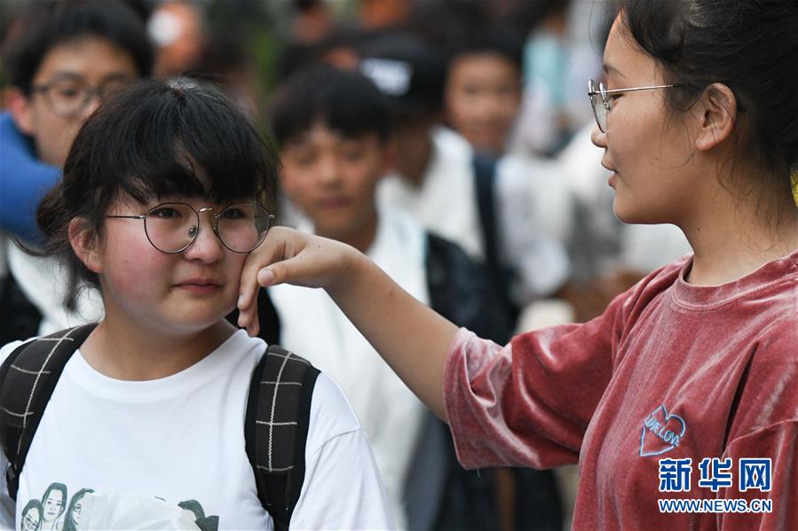 6月9日,合肥市第三十五中学西藏班的初三毕业生(左)与校友告别。 当日,安徽省合肥市第三十五中学西藏班的99名藏族学生顺利完成初中课程,返回西藏家乡参加内地西藏班中考,准备开始新的学习和生活。 新华社记者 张端 摄