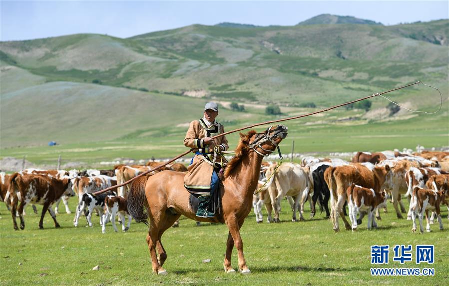 5月31日,和喜格都冷的哥哥和喜格宝音在草原上放牧。新华社记者 彭源 摄
