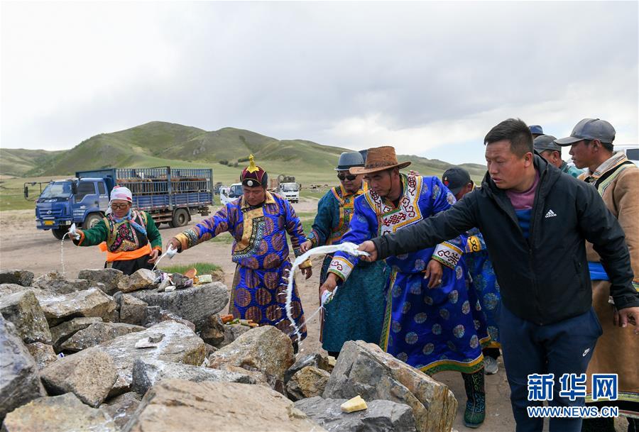 6月1日,在迁徙途中,和喜格都冷(前排右二)和家人祭敖包,祈求草原风调雨顺。新华社记者 彭源 摄