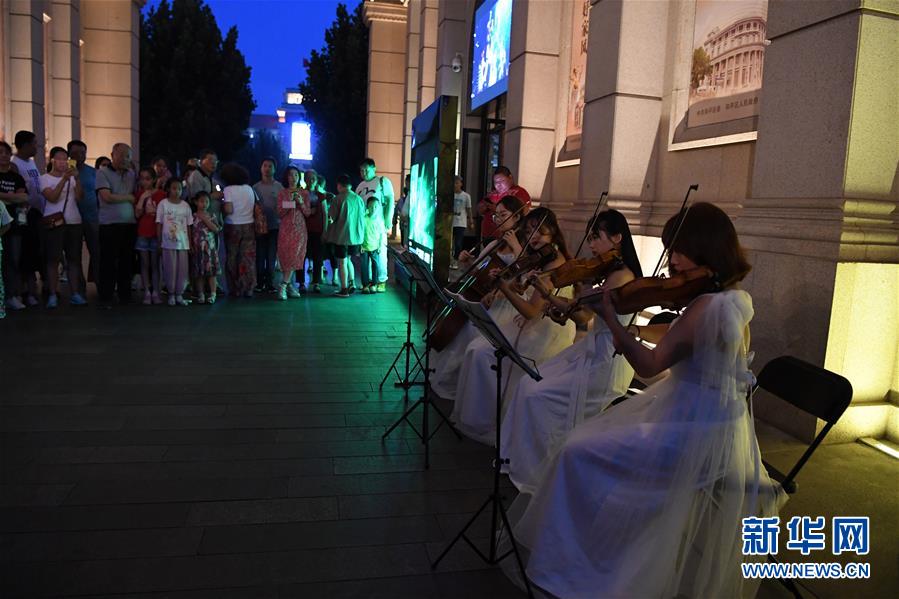 6月9日,在天津市五大道夜间经济示范街区,学生在为市民表演。新华社记者 马平 摄