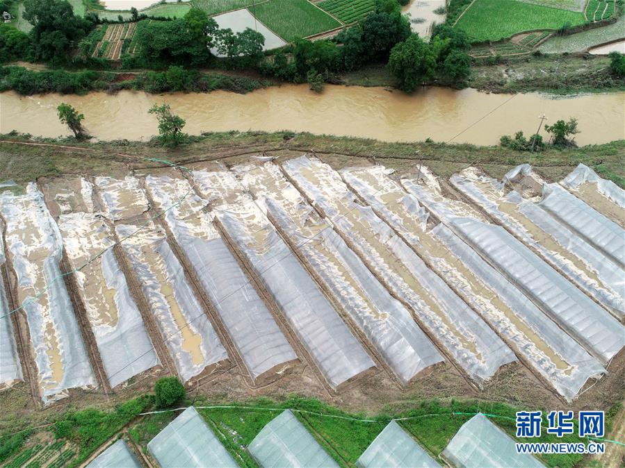 在江西省永新县莲洲乡土田村,不少果蔬大棚被洪水冲毁(6月10日无人机拍摄)。 6月10日,江西省吉安市永新县境内开始停雨转阴。由于之前强降雨导致的洪涝灾害毁了不少农田及作物,目前永新县各乡镇正积极组织开展灾后自救。 新华社记者 彭昭之 摄