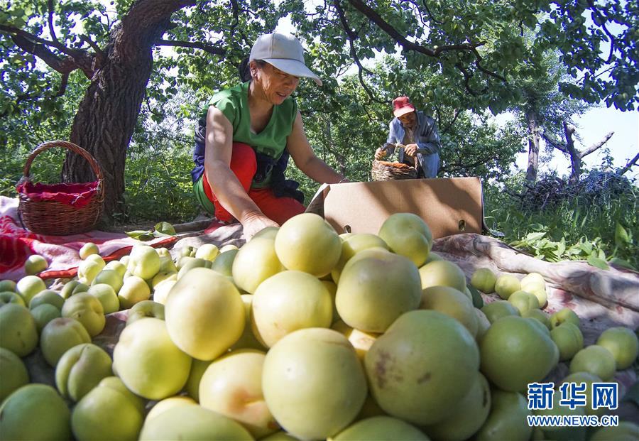 6月10日,农民在河北唐山遵化市娘娘庄乡相古庄村果园收获香白杏。 时下,河北唐山遵化市娘娘庄乡香白杏进入成熟期,当地采取果品专业合作社保底包销、经纪人收购、邮政物流合作等销售方式,使收获的香白杏销路畅通,帮助农民实现增收。 新华社发(刘满仓 摄)