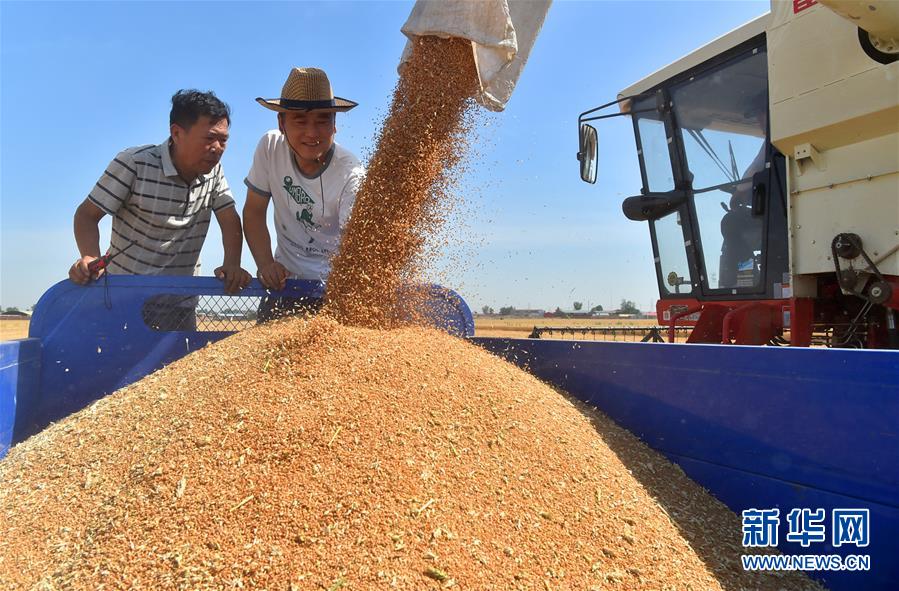 6月10日,在河北石家庄市藁城区,小麦种植户刘和宾(右)查看刚刚收获的小麦。 夏收时节,农民抓住天气晴好的有利时机抢收小麦,到处是一片繁忙的丰收景象。 新华社发(张晓峰 摄)