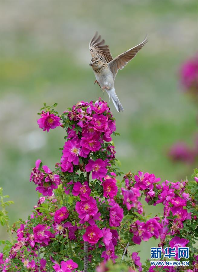 在拉萨市达孜区现代农业产业园,一只小鸟在玫瑰种植基地的玫瑰花丛中(6月9日摄)。 近日,在西藏拉萨市达孜区现代农业产业园,由西藏玫瑰生物科技发展有限公司种植的200亩玫瑰盛开,吸引众多游客前来观赏采摘。 新华社记者 张汝锋 摄