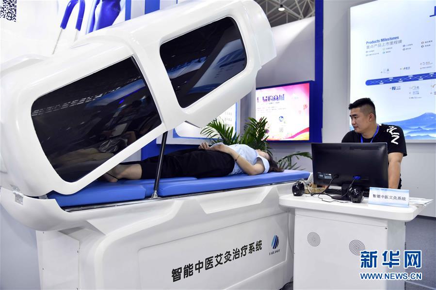 6月10日,在博鳌亚洲论坛全球健康博览会上,参观人员体验智能中医艾灸治疗系统。 当日,博鳌亚洲论坛全球健康博览会在青岛世博城开幕。本次博览会展会面积达两万平方米,200多家国内外知名企业和组织参展。 新华社记者 郭绪雷 摄