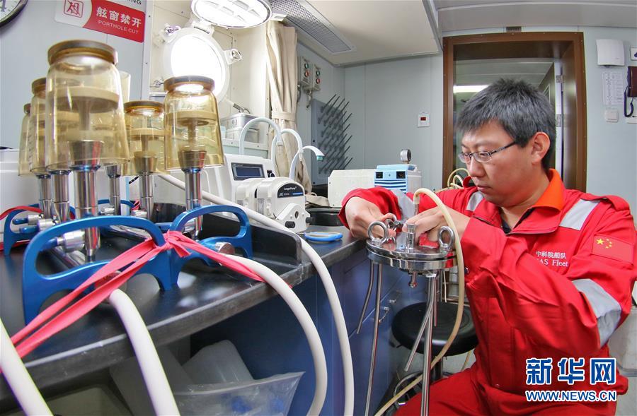6月10日,在山东烟台港,中科院船队的科研人员在“创新一”号科考船上检查调试实验仪器。 新华社发(唐克 摄)