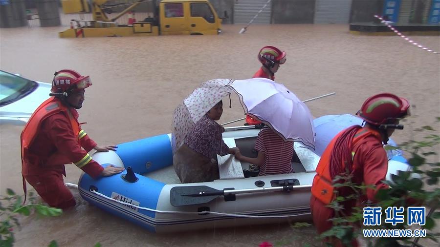 6月10日,在福建省三明市三元区,消防救援人员在转移被困群众(视频截图)。 当日,福建省三明市普降暴雨,受持续强降雨影响,市区部分路段出现内涝。 新华社发