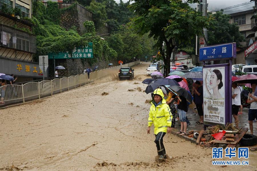 6月10日,在福建省三明市三元区,执勤人员在街头维持秩序。 当日,福建省三明市普降暴雨,受持续强降雨影响,市区部分路段出现内涝。 新华社发(周志鸿 摄)