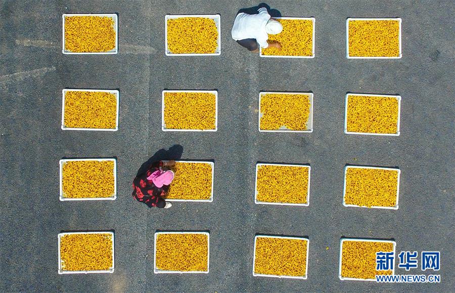 6月10日,河北省邯郸市肥乡区东漳堡镇南赵村农民在分拣晾晒菊花(无人机拍摄)。 近年来,河北省邯郸市肥乡区积极调整优化农业结构,采取“公司+基地+农户”的方式,引导农民发展特色菊花种植产业,把菊花加工成茶饮、药材等高附加值产品,带动当地农户增收致富。 新华社记者 王晓 摄