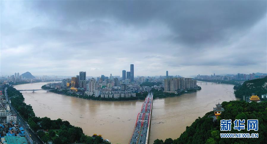 6月10日,柳江洪峰通过柳州市区河段(无人机拍摄)。 当日,受上游暴雨影响,广西柳江柳州水文站出现洪峰水位79.59米(警戒水位82.5米),部分沿江道路被洪水淹没。 新华社发(黎寒池 摄)