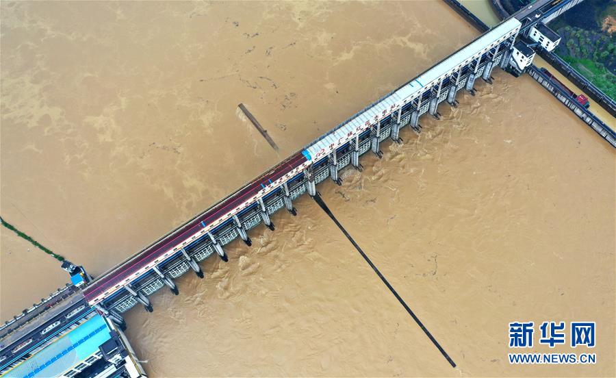 6月10日,柳江洪峰通过柳州市鱼峰区红花水电站河段(无人机拍摄)。 当日,受上游暴雨影响,广西柳江柳州水文站出现洪峰水位79.59米(警戒水位82.5米),部分沿江道路被洪水淹没。 新华社发(黎寒池 摄)